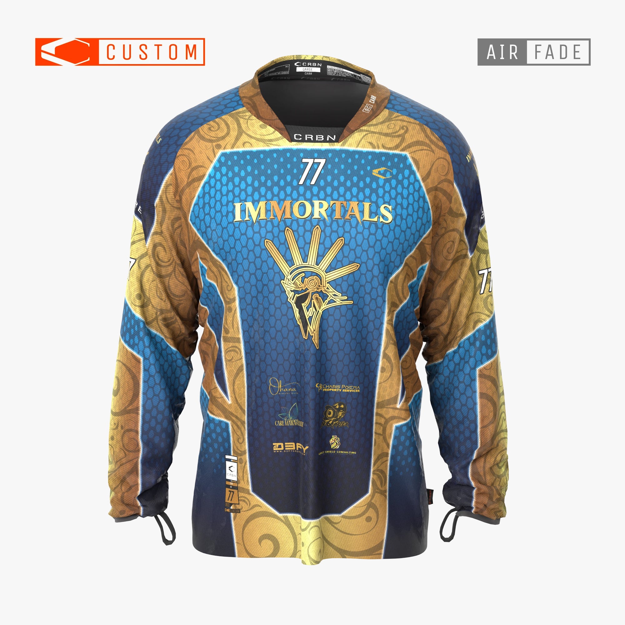 At CRBN, we’ve perfected the custom jersey process so you can focus on the game while our in-house design team handles the details. Choose a template, colors, upload your team logos or files and select your sponsor logos from our database. Three rounds of revisions included, with the design process taking only 48 hours. 4 week standard production time to your door.